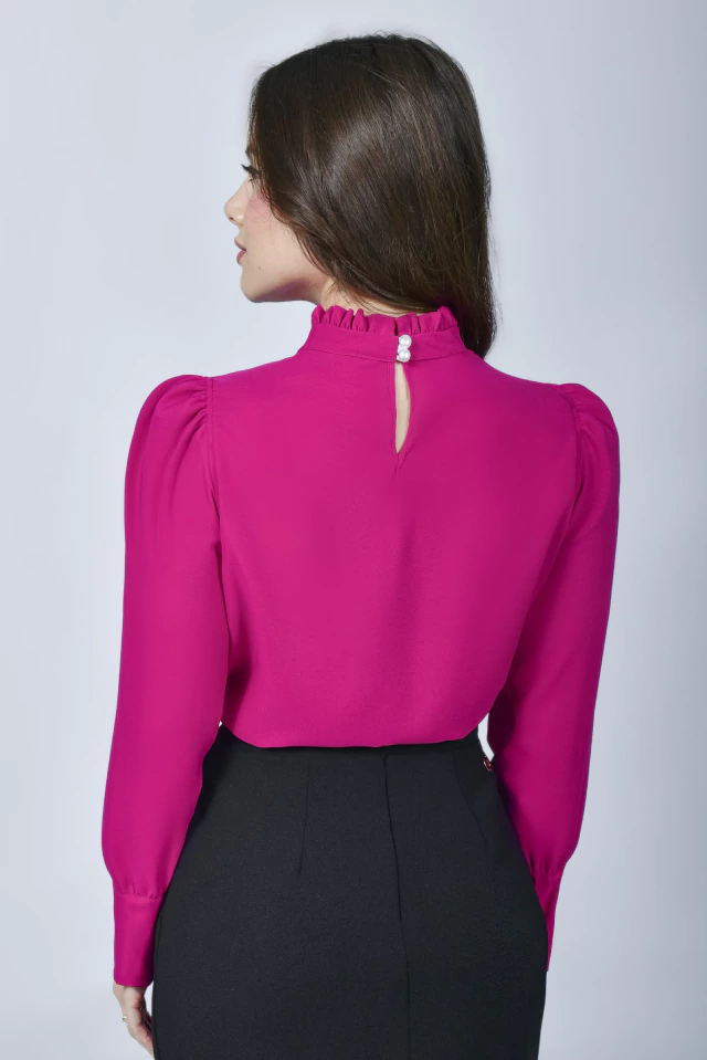 Aquela blusa indispensável! Na cor mais amada: fúcsia! Perfeita para quem ama um estilo mais clássico! Combine com saias midis, supermidis e calças para um visual harmônico! Para dar mais sofisticação ao visual, complete com salto! A Blusa Beijinho é toda confeccionada no Crepe Fluído {tecido leve} e possui: manga longa princesa com punho largo, gola alta com preguinhas, suaves preguinhas abaixo do decote e para finalizar recorte em gota atrás com botão perolado funcional. Para você se sentir deslumbrante em todas as ocasiões!