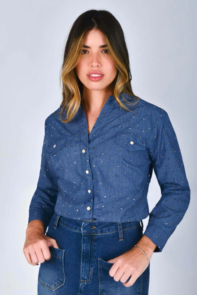 A peça curinga que não pode faltar! A camisa versátil e cheia de personalidade, para você brilhar ainda mais! Com lavagem jeans escura super moderna e aplicações de strass, é perfeita para elevar qualquer visual. Ideal para quem ama praticidade sem abrir mão do estilo. O modelo Clássico Romântico é todo confeccionado no tecido Denin Cristal {tecido bem leve e fresco} e possui: manga 7/8 com punho, ombreiras, gola alta, decote com leve abertura em V, lapela na parte da frente com botão {enfeite} e botões de pressão perolados {funcionais}, perfeito para as mamães que amamentam! Uma peça maravilhosa e de uma elegância sem igual!