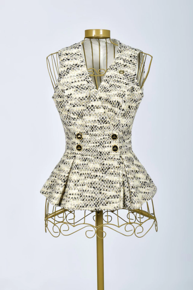 Um conjunto deslumbrante e cheio de detalhes apaixonantes! Os conjuntos de saias e coletes são considerados práticos, versáteis e sofisticados. Uma peça curinga para você criar visuais cheios de elegância para qualquer ocasião! Todo confeccionado no Tweed Glow com Elastano {tecido bem confortável com fios de Lurex dourado}, ele é repleto de estilo, sendo indispensável! Também é uma ótima opção utilizar as peças separadas e criar visuais fabulosos!