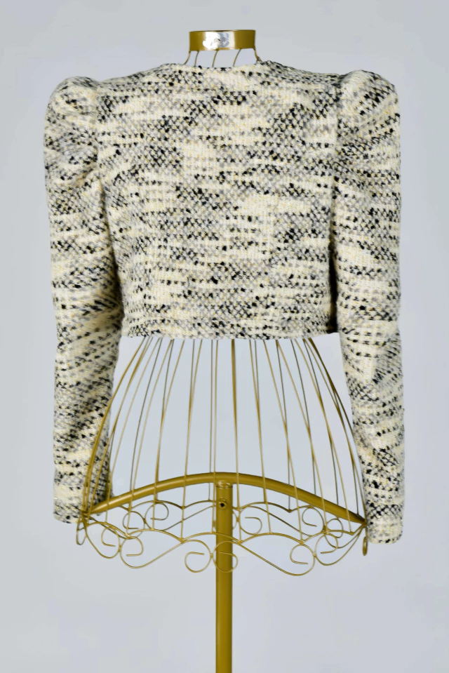 O casaqueto possui: forro, modelagem mais curta, manga longa com detalhe de preguinhas na altura do ombro e punho, lapelas na parte da frente com botões de mustachinhos de enfeite {banhados a ouro}. A peça perfeita para compor um visual atemporal cheio de sofisticação!