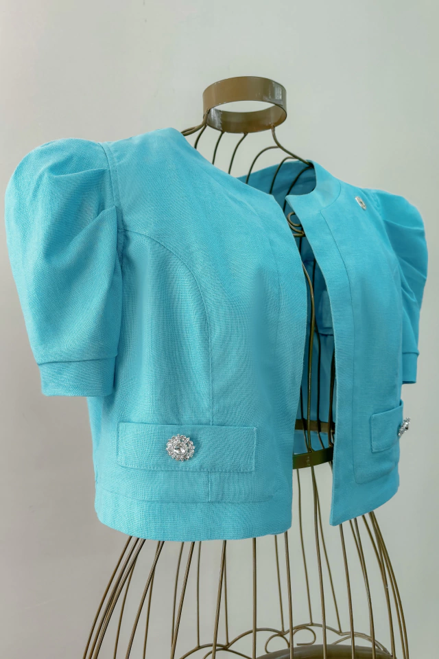 O Casaqueto possui: modelagem mais curta, forro, manga curta com preguinhas na altura do ombro e lapela com botão de metal {enfeite} todo em strass {uma verdadeira joia} na frente.
