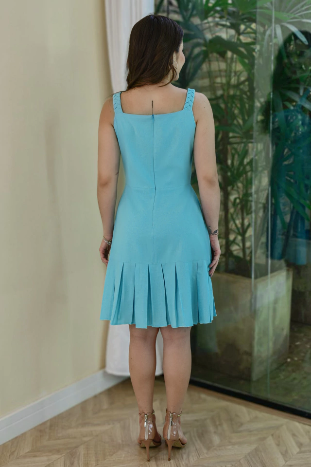 O Vestido possui: forro, corpinho acinturado, decote levemente princesa, alças trançadas {feito manualmente}, busto todo desenhado com franzidinho, botões de enfeite na frente {bordados manualmente, um a um}, zíper atrás e para finalizar, charmosas preguinhas no barrado.