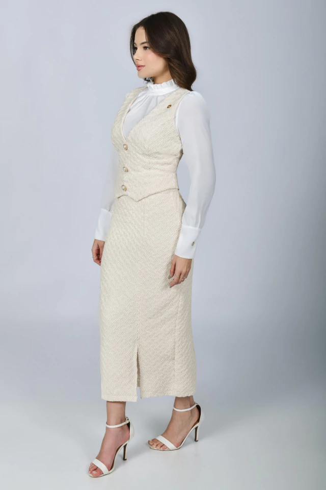 Um conjunto deslumbrante e cheio de detalhes apaixonantes! Os conjuntos de saias e coletes são considerados práticos, versáteis e sofisticados. Uma peça curinga para você criar visuais cheios de elegância para qualquer ocasião! O Conjunto Midi Brilho de Paris é todo confeccionado em Tweed Chanel com fios de Lurex {tecido bem confortável com elastano}, ele é repleto de estilo, sendo indispensável! Também é uma ótima opção utilizar as peças separadas e criar visuais fabulosos!