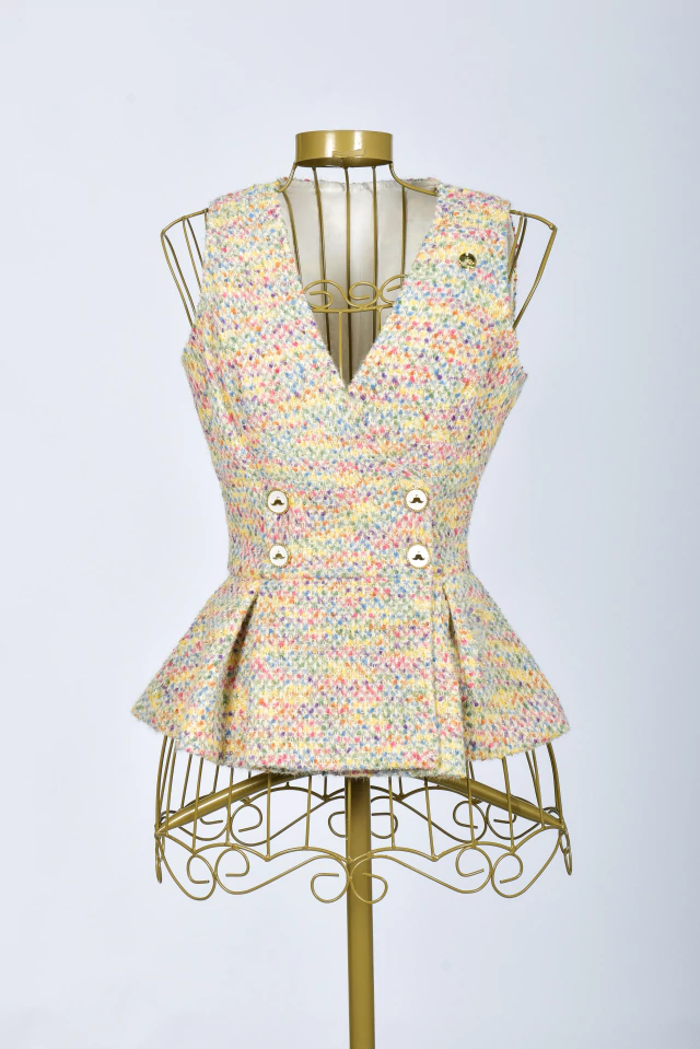 Um conjunto deslumbrante e cheio de detalhes apaixonantes! Os conjuntos de saias e coletes são considerados práticos, versáteis e sofisticados. Uma peça curinga para você criar visuais cheios de elegância para qualquer ocasião! Todo confeccionado no Tweed Glow com Elastano {tecido bem confortável com fios de Lurex dourado}, ele é repleto de estilo, sendo indispensável! Também é uma ótima opção utilizar as peças separadas e criar visuais fabulosos!