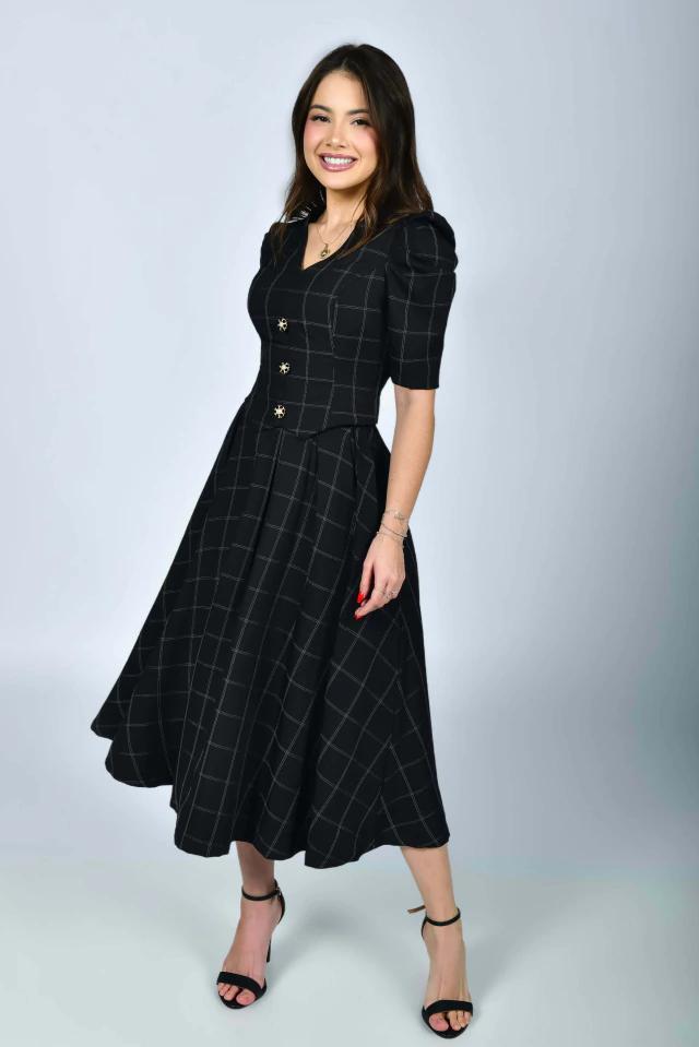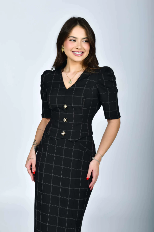 Aquele cropped indispensável! Em um lindo tecido cheio de delicadeza e perfeito para quem ama um estilo de estampa clássica quadriculada! Crie composições com saias e calças para um visual mais elegante! Todo confeccionado em Alfaiataria Cloe {Com Toque de Viscose e Elastano} e possui: forro, decote V, manga 3/4 com suaves preguinhas na altura do ombro, botões de metal em formato de flor com detalhes em veludo e pérolas {enfeite}, recorte no barrado {com bico} e botões de pressão perolados atrás {funcionais} para completar essa preciosidade!