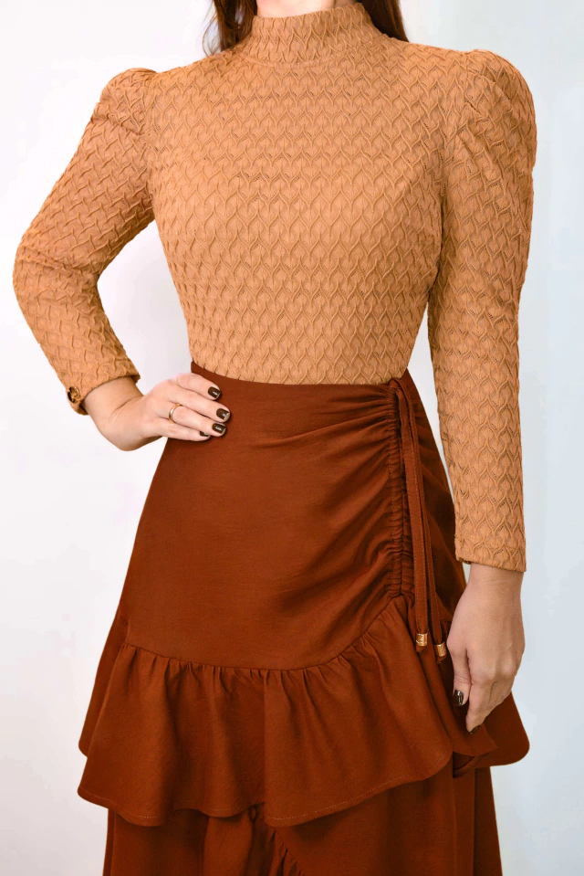 A saia perfeita para deixar seu visual ainda mais charmoso! Ideal para momentos especiais ou para dar um toque especial ao dia a dia. Seu corte e modelagem mullet, vão fazer você se sentir linda e confortável! Os babados aplicados em camadas trazem um toque romântico e moderno, ideal para compor visuais versáteis do dia à noite. Crie composições lindíssimas com blusas e camisas! A Saia Midi Boho Avelã é toda confeccionada em Alfaiataria Berlim, possui: forro, cós alto, cordão na cintura {com regulagem, você pode fazer lacinho na frente ou usar soltinho} e lindas ponteiras em metal {banhadas a ouro} personalizada da Mustache, zíper atrás e para finalizar, saia com babados para dar um charme a mais!!! Uma modelagem impecável e charmosa que só a Mustache tem!