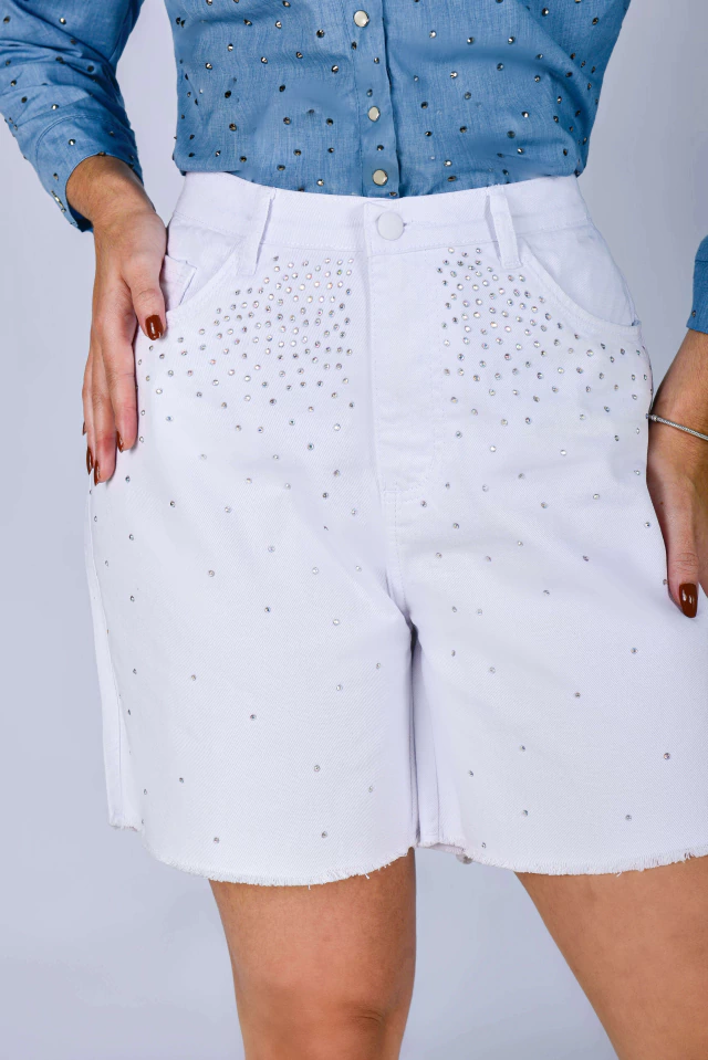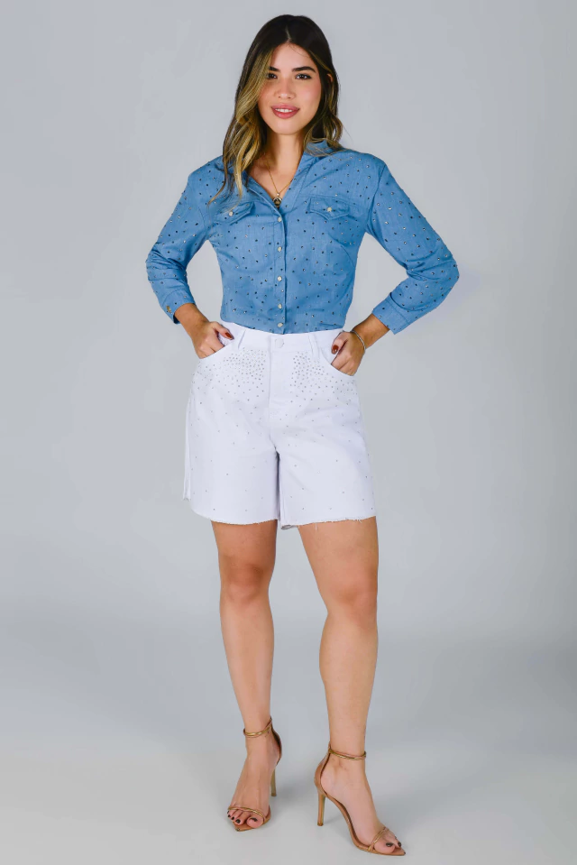 O short perfeito para deixar seu visual ainda mais charmoso! Perfeito para quem ama unir conforto com um toque de glamour! Com uma modelagem moderna e comprimento modesto, as aplicações de pedrarias garantem brilho e sofisticação na medida certa! O Short Brilho de Cristal é todo confeccionado em Jeans de Algodão e possui: cós alto com passante, zíper na frente, fechamento com botão encapado na frente, bolsinhos funcionais na frente e atrás, barra com leve desfiado e para finalizar aplicações de pedrarias {furta-cor} na frente.