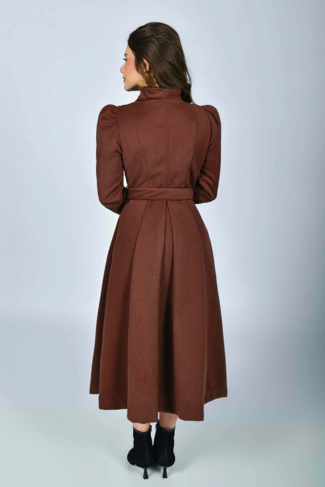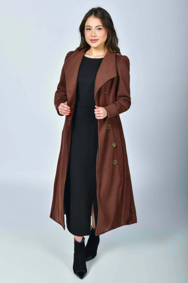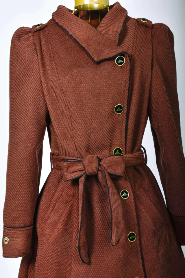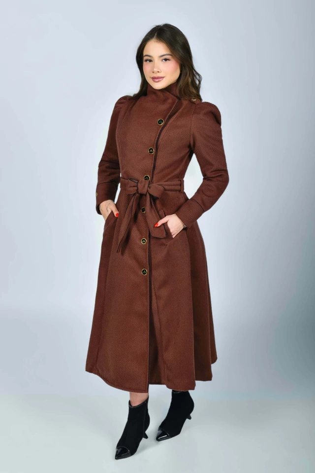 Aquela peça perfeita para vestir nossas Mustachetes elegantemente por vários invernos! Em um tom marrom, carrega a elegância e o poder de uma bela peça em lã! Uma peça que transformará qualquer visual com perfeição! O sobretudo Manhattan pode ser usado em diversos ambientes e ocasiões, seja aberto {como sobretudo} ou todo fechado {como vestido}! Todo confeccionado na Lã Batida Texturizada {tecido com caimento firme e estruturado}, rico em detalhes e possui: forro, modelo transpassado com acabamento em viés {preto}, manga longa princesa com detalhe de viés {preto} no punho e botão {enfeite} preto e dourado na altura do ombro com martingale, gola colarinho {pode ser usado mais fechadinho ou abertinho} com detalhes em viés {preto}, bolsinhos exclusivos na diagonal, lindos botões personalizado de Mustachinhos funcionais {banhados a ouro} na frente, pregas na parte de trás e faixinha com acabamento em viés {preto} para modelar ainda mais a sua cintura! Impossível resistir ao conforto da textura quentinha e macia da lã.