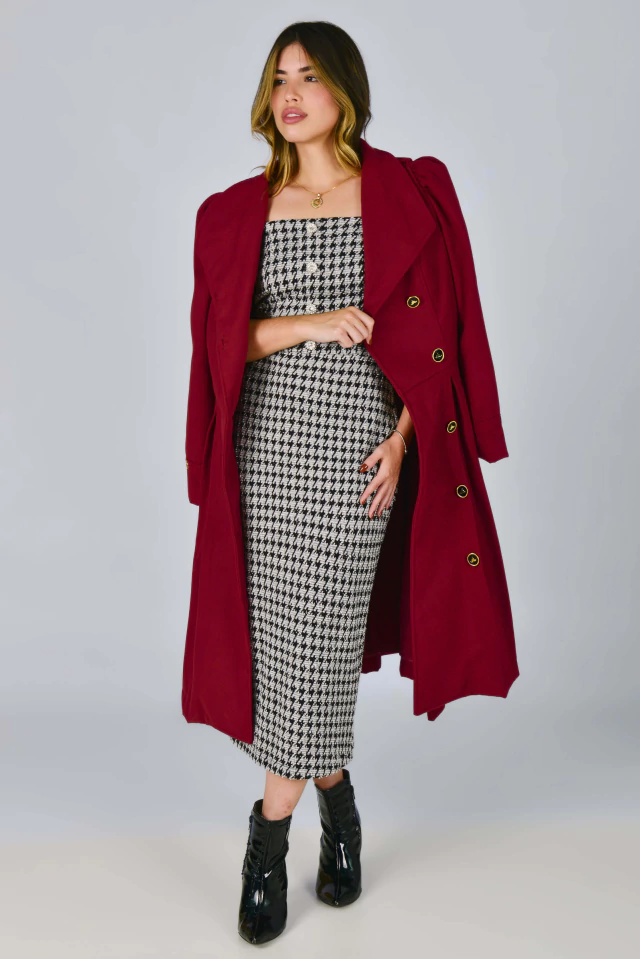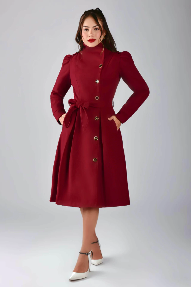 Um sobretudo cheio de detalhes primorosos! Aquela peça perfeita para os dias mais friozinhos! Em um tom vermelho cereja, carrega a elegância e o poder de uma bela peça em lã! Uma peça que transformará qualquer visual com perfeição! O Sobretudo Midi Big Ben pode ser usado em diversos ambientes e ocasiões, seja aberto {como sobretudo} ou todo fechado {como vestido}! Todo confeccionado na Lã Batida {tecido com caimento firme e estruturado}, possui: forro acetinado, modelo transpassado na frente, manga longa princesa com detalhe de tira {fixa} no punho e botão {enfeite} dourado na altura do ombro, gola colarinho {pode ser usado mais fechadinho ou abertinho}, bolsinhos, fofíssimos botões de Mustachinhos funcionais {banhados a ouro} na frente, charmosas preguinhas embutidas na saia {parte da frente e de trás} e faixinha para modelar ainda mais a sua cintura! Impossível resistir ao conforto da textura quentinha e macia da lã.