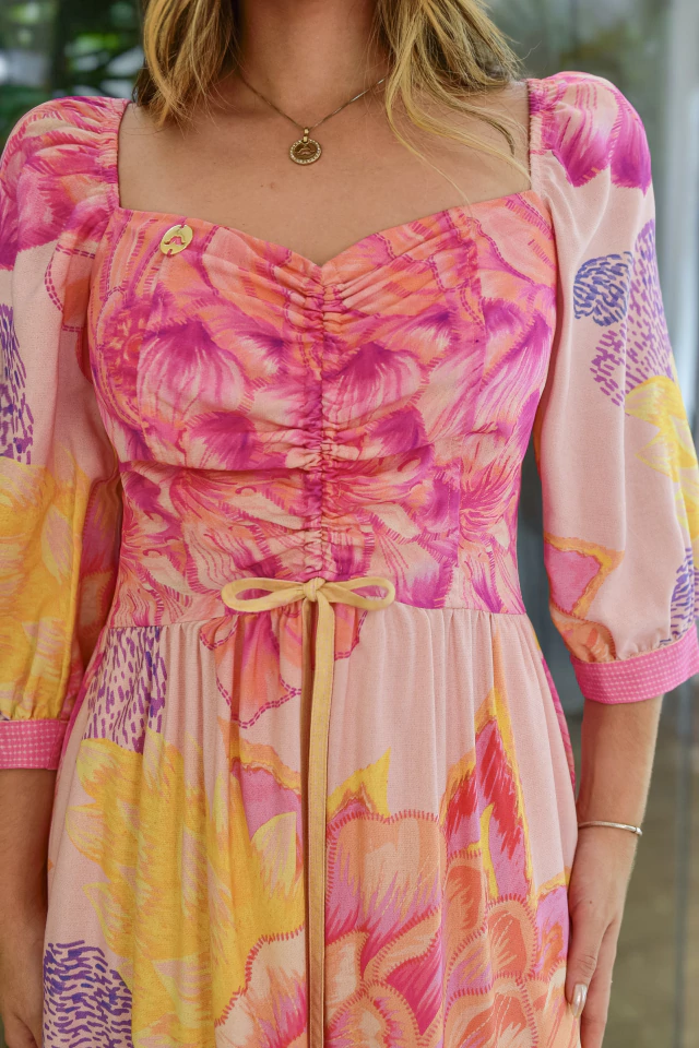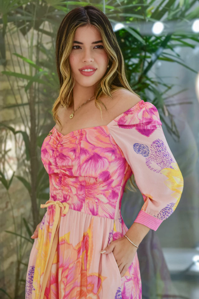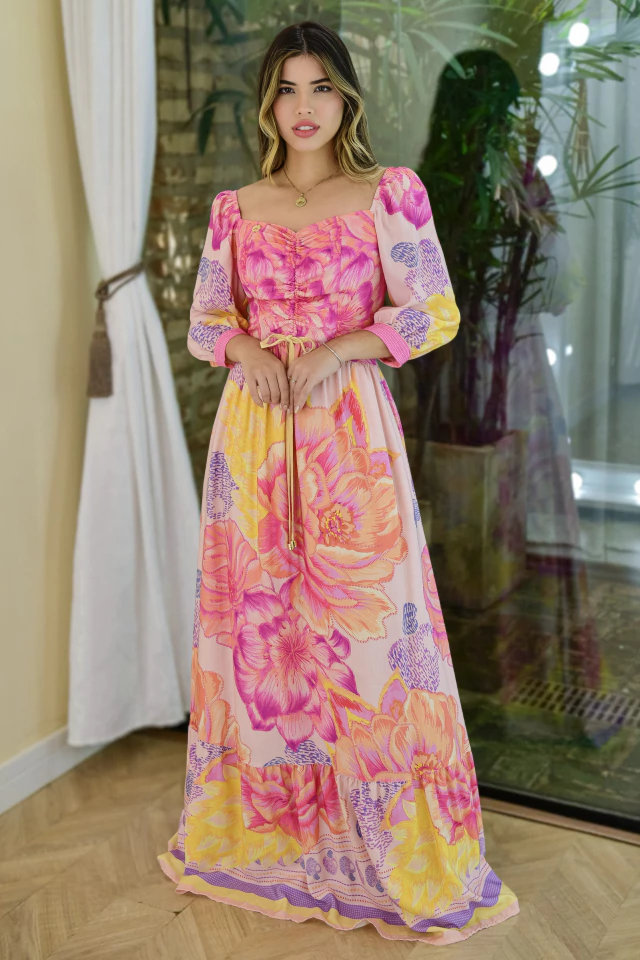 A escolha perfeita para quem busca sofisticação e leveza! Com uma estampa floral delicada em tons de rosa que se distribuem por toda a peça, criando um visual fresco e romântico, enquanto o comprimento longo exala um charme atemporal! O Vestido Longo Beleza Tropical é todo confeccionado no tecido Viscose Ipanema {bem leve e fresco} e possui: forro de algodão, manga 7/8 com elástico na alça {pode ser usado abertinho ou fechadinho} com punho, decote princesa, corpinho franzido e cordão {com regulagem} para fazer lacinho na frente com lindas ponteiras em metal {banhadas a ouro} personalizada da Mustache, bolsinhos discretos nas laterais, zíper atrás e babado na saia com recorte levemente franzidinho. Modelagem única e acabamentos impecáveis que fazem toda a diferença no visual!
