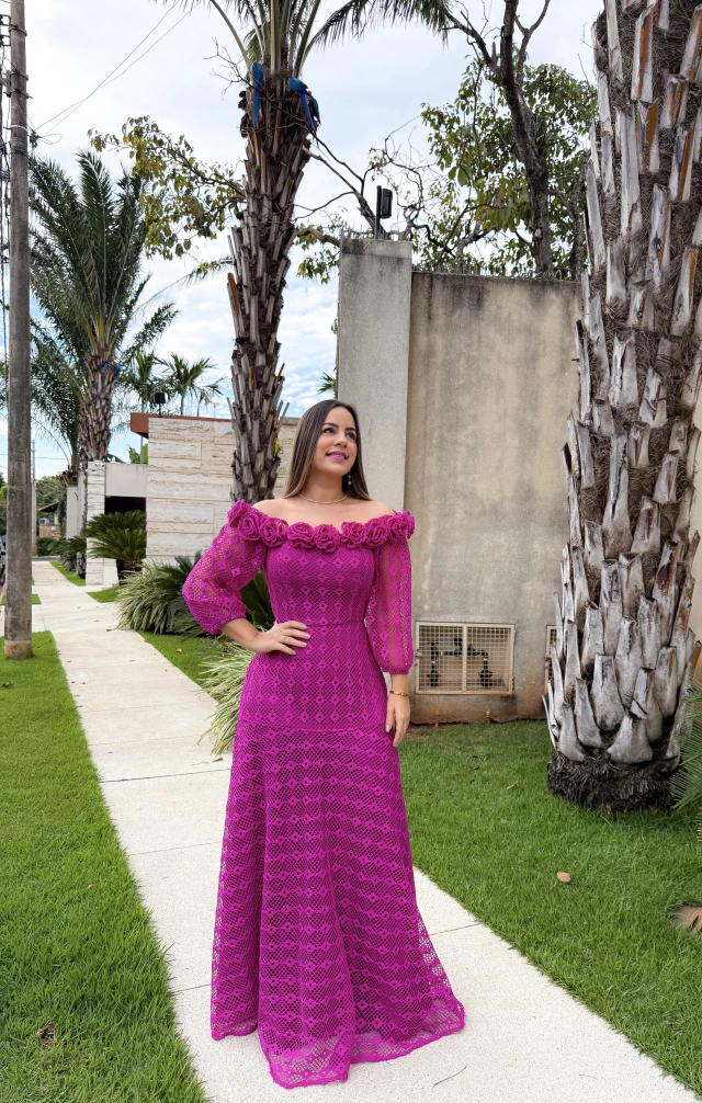 Um vestido esplendoroso, perfeito para fazer parte dos momentos mais inesquecíveis da sua vida! Em uma modelagem cheia de frescor e sofisticação, valorizando as curvas femininas de maneira sutil e elegante! A composição perfeita da cor Fúcsia com o tecido Crochê {tecido todo vazado}, transformam a peça em uma verdadeira obra de arte! O Vestido Longo Flowers é todo confeccionado em Crochê Imperial {tecido nobre, super confortável e bem resistente} e possui: forro, decote canoa com lindas flores 3D {fixas} feitas manualmente uma a uma, manga 7/8 soltinha {vazada, com respiro} com elástico e babadinho na altura do ombro {pode ser usado abertinho ou fechadinho} e elástico no punho, corpinho estruturado, recorte no quadril, zíper atrás e saia com bastante tecido para um caimento maravilhoso do jeitinho que amamos! A escolha perfeita para todas as ocasiões!