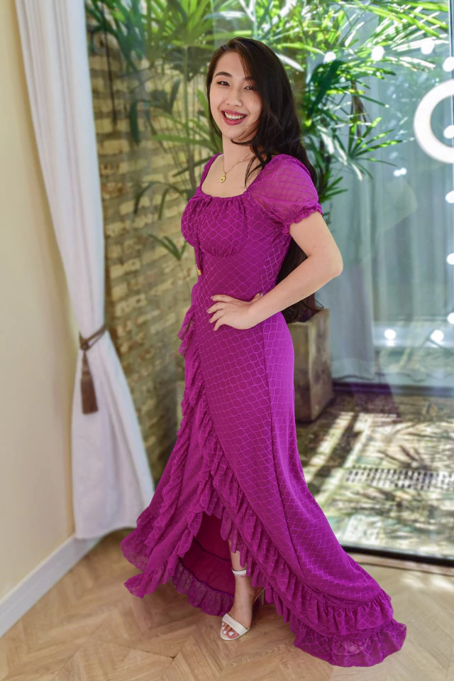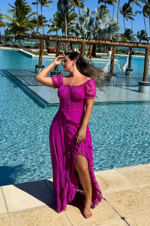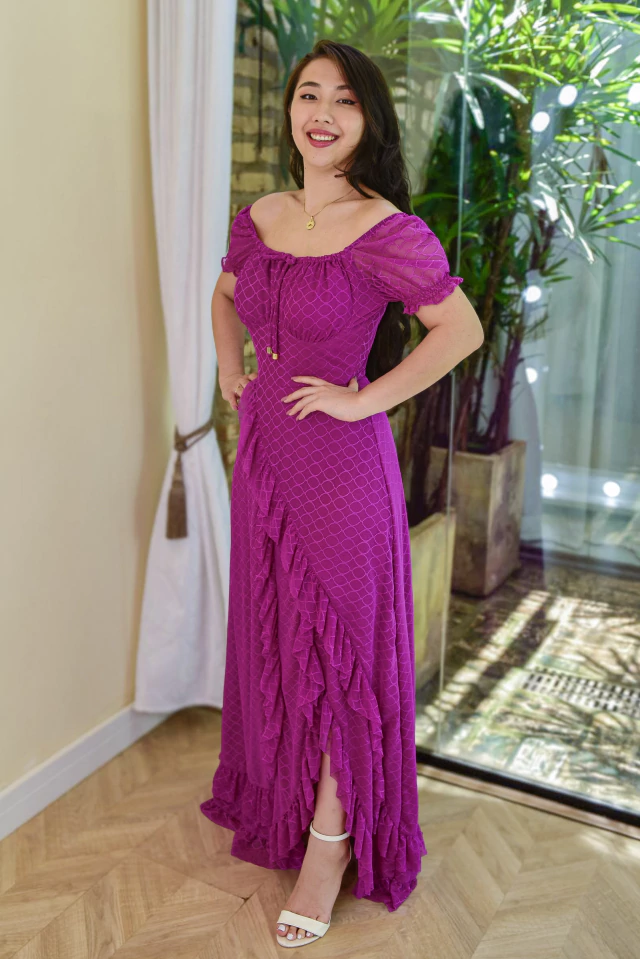 Uma peça feminina e super delicada! A opção perfeita para quem deseja uma modelagem que valoriza o corpo, alongando a silhueta! Leve, feminino e super delicado. Seus detalhes primorosos trazem ao look um visual ainda mais sofisticado! O Vestido Longo Preciosidade é todo confeccionado no Tule Texturizado {bem fluído e fresco} e possui: forro, decote com leve abertura em V e lacinho {ajustável} com lindas ponteiras de metal personalizadas da Mustache {banhadas à ouro}, manga curta com elástico na alça {pode ser usado abertinho ou fechadinho} e lastex no punho com babadinho, busto franzidinho, cintura marcada, zíper atrás, saia com babados na diagonal e leve fenda na frente que amamos! Um look com muita elegância, delicadeza e acima de tudo, conforto!