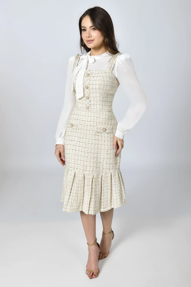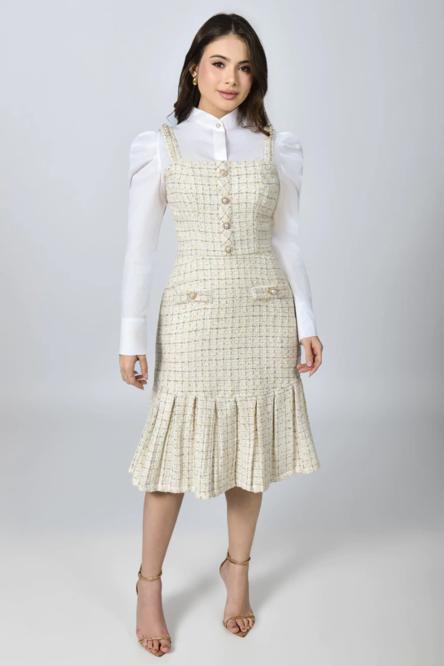 Uma peça super delicada com detalhes simplesmente apaixonantes! Uma modelagem que realça ainda mais a beleza do Tweed. A composição perfeita de tirar suspiros! O Vestido Midi Balé em Londres é todo confeccionado no Tweed Queen com fios de lurex dourado {tecido encorpado} e possui: forro, decote reto, alça larga com detalhes em pérolas e strass {bordadas uma a uma manualmente}, corpinho estruturado, tira na frente com botões de metal com detalhes em strass e pérolas {enfeite} bordados manualmente, lapelas na saia com botões em metal, saia com preguinhas e zíper atrás.