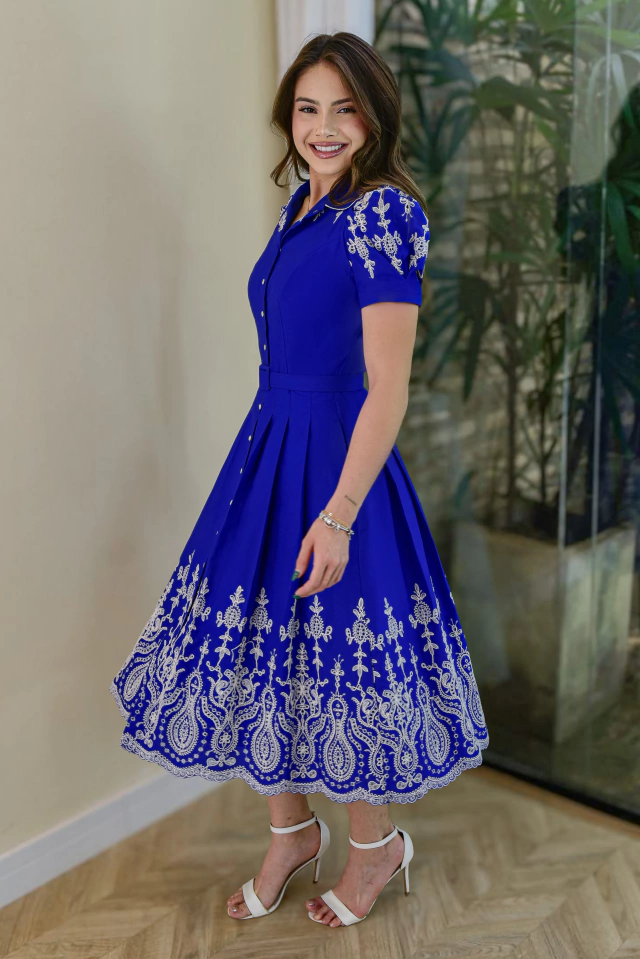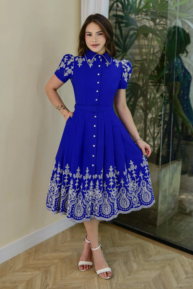 Um modelinho que exala elegância e romantismo por trás das formas de florais todos bordadinhos! Seus detalhes primorosos trazem maior sofisticação ao look, perfeito para todas as estações! Tudo pensado com muito carinho para te deixar como uma verdadeira princesa. O vestido midi Delicadeza no Olhar é confeccionado no Algodão Bordado {100% algodão} e possui: forro, gola colarinho {pode ser usado também mais abertinha por conta dos botões serem funcionais} com acabamento em viés {tom branco}, corpinho estruturado, abertura com botões de pressão perolados na frente {funcionais, perfeitos também para as mamães que amamentam}, manga curta princesa com detalhe de preguinha na lateral, bolsinhos fofos, saia com charmosas preguinhas, barrado com acabamento em ondinhas todo bordado e para finalizar, acompanha cinto encapado para dar um charme a mais na peça! Uma verdadeira perfeição em forma de vestido!
