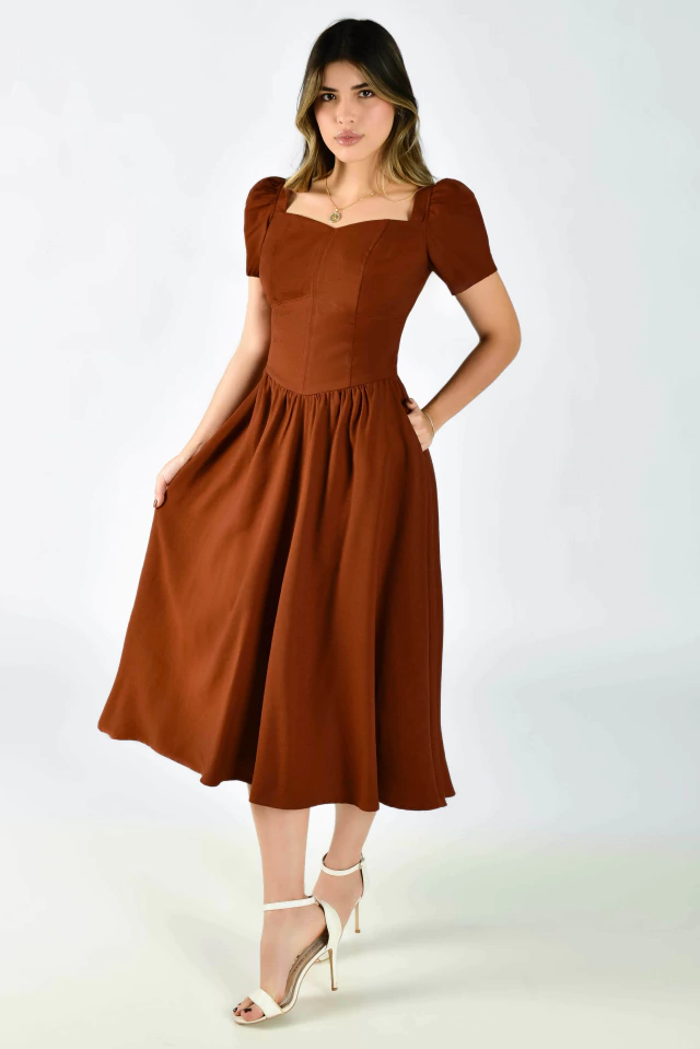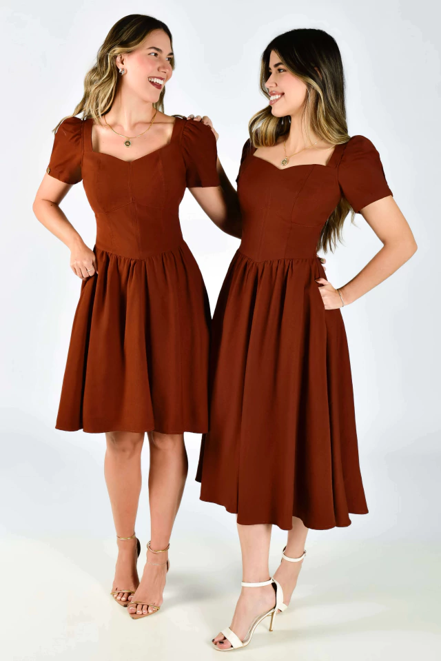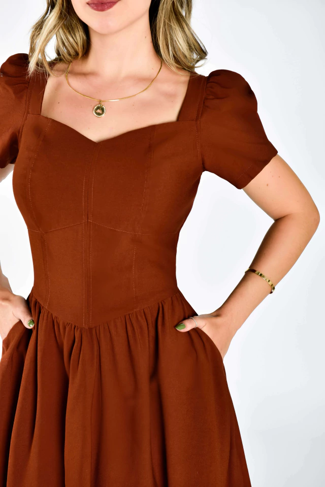 A peça perfeita para quem ama esbanjar muito charme por onde passar! Em uma linda modelagem, que traz um ar retrô e romântico! Perfeito para te acompanhar em todas as ocasiões! O Vestido Midi Flor de Canela é todo confeccionado em Alfaiataria Berlim e possui: forro, decote princesa, manga curta princesa com detalhe de preguinha na lateral, corpinho estruturado e todo rebatido {bem retrô}, recorte na cintura em V com suaves nervurinhas, bolsinhos que amamos, saia com bastante tecido {bem menininha} para um caimento perfeito e zíper atrás. Uma modelagem impecável e charmosa que só a Mustache tem!