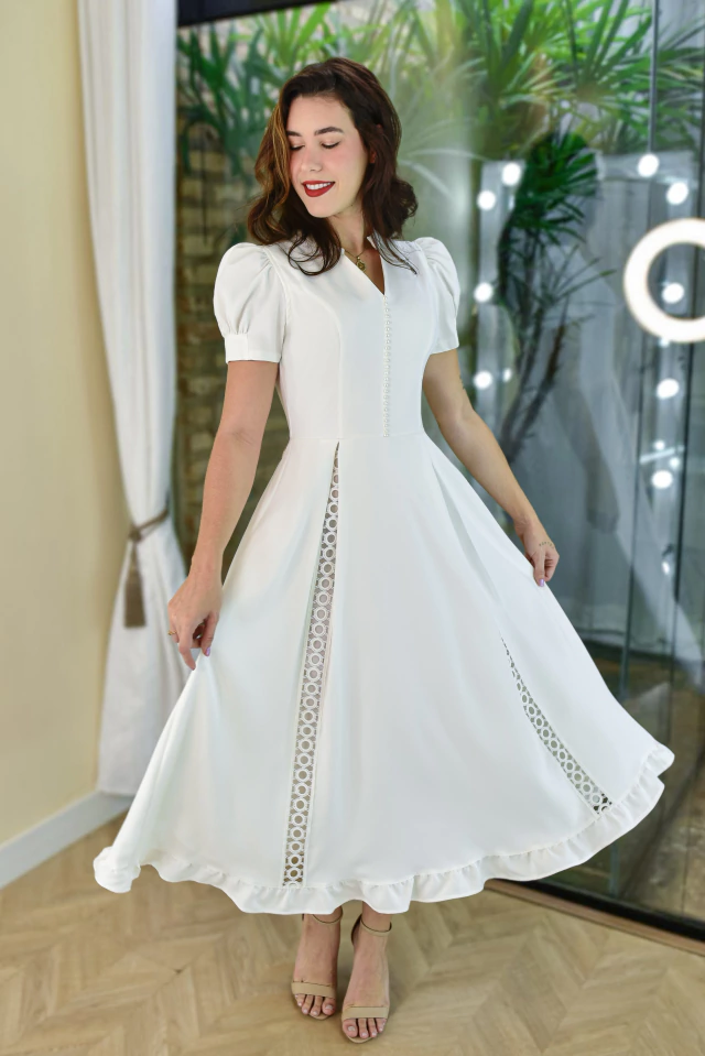 Em um belo tom branco, bem delicado, perfeito para essa estação! É todo confeccionado na Alfaiataria Texturizado {toque macio} e fica ainda mais perfeito com os detalhes em guipir embutido na saia. No comprimento midi, possui: forro, manga curta princesa com recorte na lateral e leve franzido acima do punho, decote em V, corpinho acinturado com bordado de mini pérolas {bordadas manualmente, uma a uma}, guipir na saia, babadinho discreto no barrado, zíper atrás e saia com modelagem impecável. Um modelinho com muito conforto e elegância!