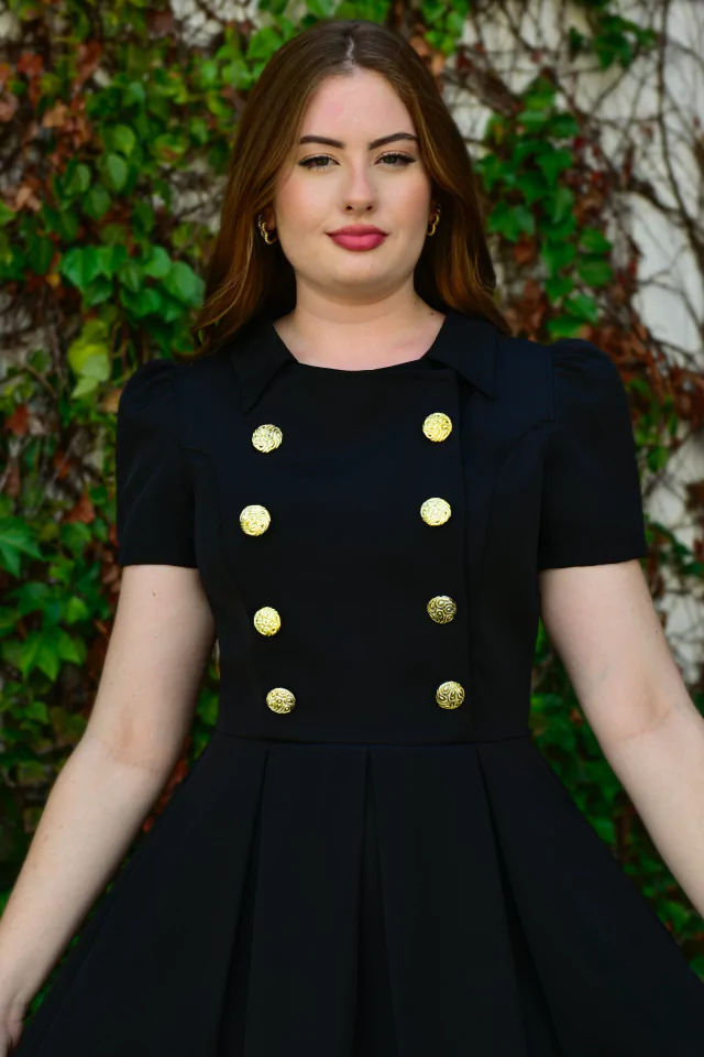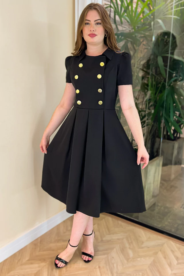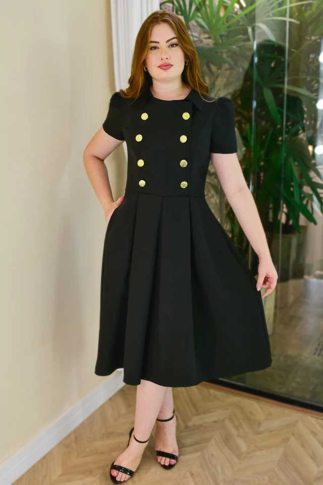 Um modelo clássico de vestido que vai te deixar extremamente elegante! O vestido midi Retrô Dourado é todo confeccionado no alfaiataria texturizado e possui: preguinhas, bolsinhos fofos, manguinha princesa, golinha e para finalizar, efeito transpassado no busto com botões dourados de enfeite, para dar aquele charme único e incrível!