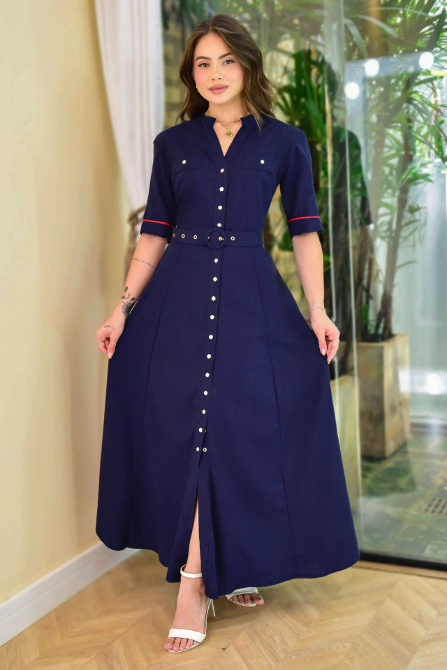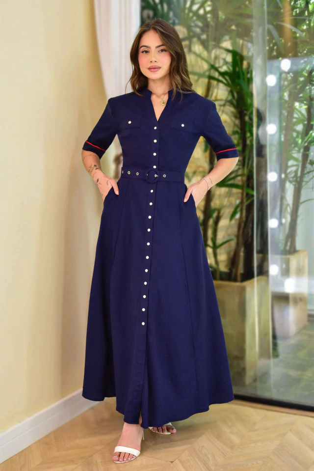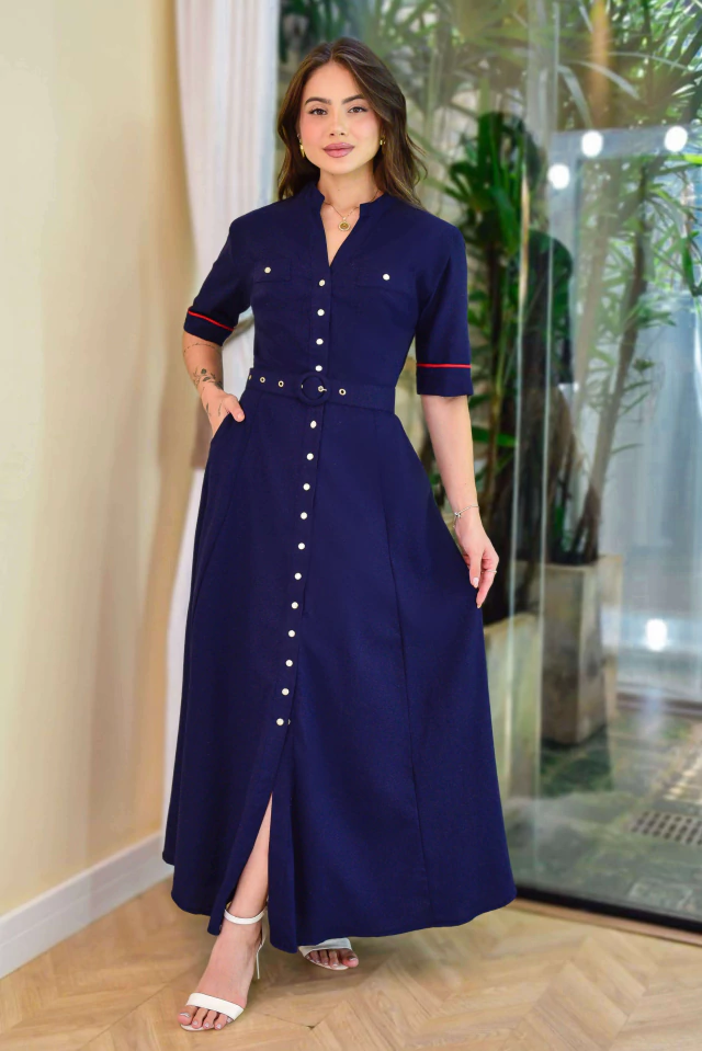 Para você se sentir linda e pronta com uma única peça! Um modelo perfeito para todas as estações! Confeccionado no comprimento mais querido: supermidi! Em uma modelagem maravilhosa e super tendência, o modelo Clássico Romântico, é todo confeccionado em fibra natural, no tecido Linho Viena com Elastano, forrado e possui: gola alta com decote em V, manga 3/4 com viés {vermelho} no punho, ombreiras embutidas, lapela na parte da frente com botão {enfeite}, botões de pressão perolados na frente e funcionais {perfeitos também para as mamães que amamentam}, corpinho estruturado, bolsinhos fofos, fenda na frente, cinto encapado e saia com recortes para dar um caimento perfeito.