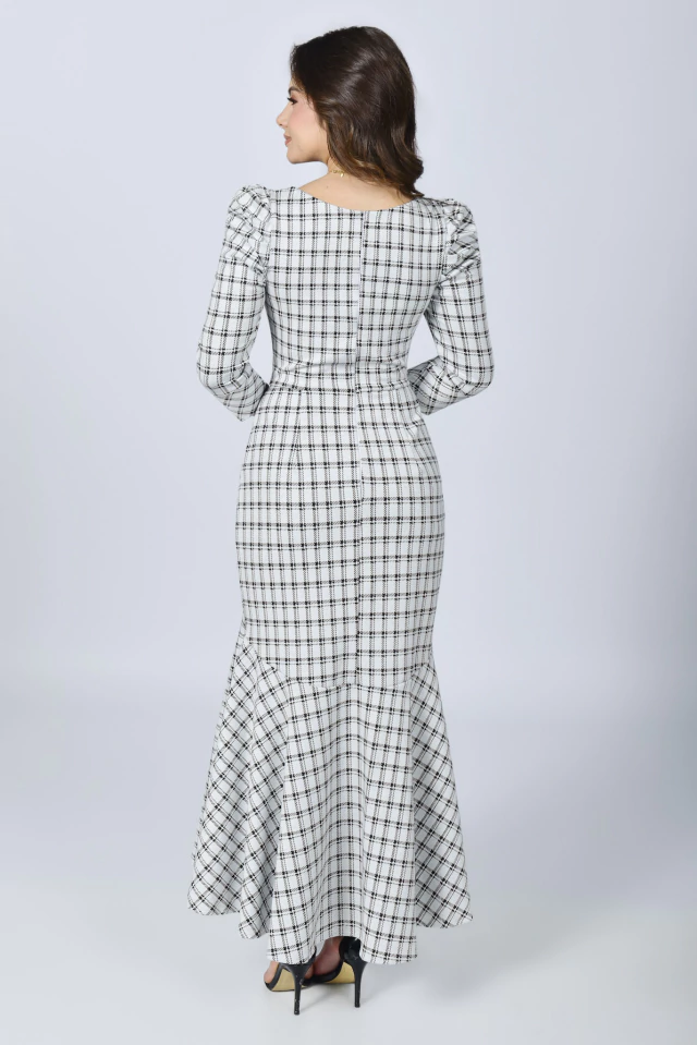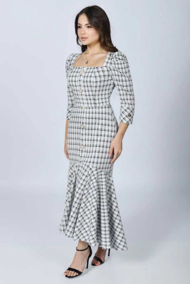 Uma peça que une charme e sofisticação em cada detalhe. A estampa quadriculada traz um toque clássico e atemporal, enquanto o corte sereia valoriza a silhueta feminina, ajustando-se ao corpo e abrindo suavemente na parte da saia. O Vestido Supermidi Desejo é todo confeccionado no Alfaiataria Tweed {Tecido bem confortável, com elastano}, possui: forro, decote quadrado com elástico, manga 7/8 com preguinhas na altura do ombro e punho, corpinho estruturado, botões de metal {fixos} perolados de enfeite na frente, saia com modelagem sereia {peplum}, ziper atrás e para finalizar barra mullet {com caída na parte de trás} que adiciona movimento e sofisticação ao visual! A escolha perfeita para todas as ocasiões mais que especiais!