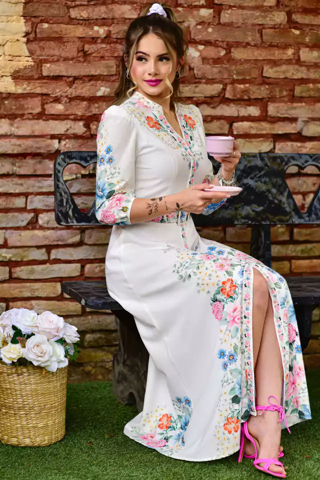 Uma estampa localizada clássica, doce e delicada! A beleza das flores, rosas e folhagens coloridinhas que parecem pinturas feitas a mão {uma verdadeira obra de arte} trazem um visual super elegante e romântico à peça! Uma peça pensada com muito amor e carinho para marcar os momentos mais incríveis e inesquecíveis de nossas Mustachetes! Perfeito para o dia a dia e também para ocasiões mais especiais! O vestido supermidi Lago de Como é todo confeccionado no tecido Noruega: Algodão com Viscose {bem leve e fresco} e possui: forro, corpinho estruturado, gola alta com leve abertura em v {que traz um frescor}, manga 7/8 princesa com elástico no punho {pode ser ajustada conforme sua preferência}, tira fake na frente em estampa composê {com mini floral}, fenda discreta na frente, zíper atrás e cinto encapado estampado. Beleza e conforto em uma única peça!