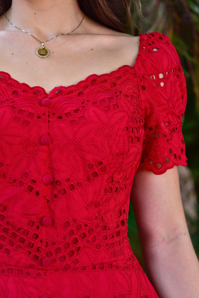 Um tom de vermelho cereja poderoso, com a cara dessa estação! A escolha perfeita para quem busca sofisticação e delicadeza. Com um corte que valoriza a silhueta, ideal para ocasiões especiais como festas, casamentos e almoços ao ar livre, esse vestido é a escolha ideal para destacar sua beleza com um toque de frescor e elegância. Confeccionado em fibra natural no tecido Laise Floral, o modelo Supermidi Lindo Sonho possui: forro, decote levemente princesa com acabamento em ondinhas bordadas, charmosos botões encapados {enfeite} bordados manualmente na frente, manga curta com elástico na alça {pode ser usado abertinho ou fechadinho} com acabamento em ondinhas no punho, corpinho estruturado, saia com recorte levemente franzido, acabamento em ondinhas no barrado, leve fenda na frente e zíper atrás. Uma peça incrível que precisa fazer parte da sua vida!