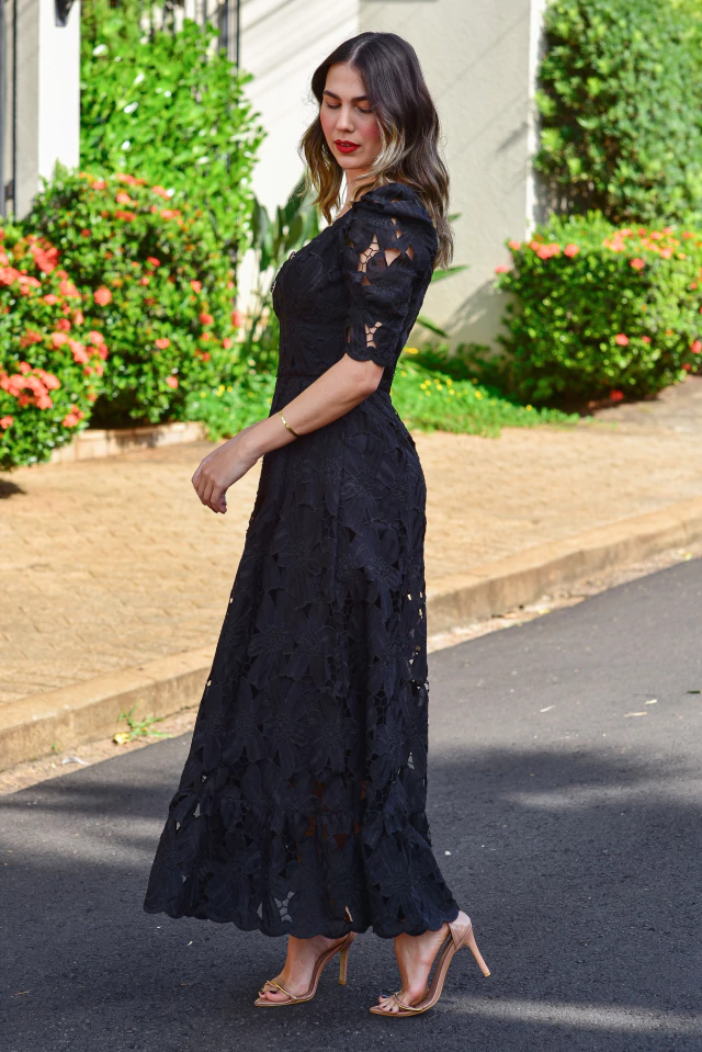 Um modelo delicado e romântico, ainda mais com essa composição de fibra natural no tecido Algodão Rechilieu, na cor preta, deixando tudo em sua volta ainda mais charmoso! Uma peça incrível para fazer parte dos momentos mais especiais da sua vida, perfeita para todos os tipos de silhuetas! O Vestido Supermidi Precioso Momento possui: forro de algodão, decote com acabamento em ondinhas bordadas, charmoso botão exclusivo com detalhes em veludo em formato de flor {enfeite} bordados manualmente na frente, manga princesa 3/4 com acabamento em ondinhas no punho, corpinho acinturado, saia com recortes na vertical {frente e atrás} com uma modelagem perfeita, zíper atrás, recorte com leve franzidinho acima do barrado e acabamento em ondinhas. Uma peça cheia de charme e pensada em todos os detalhes para você arrasar com muita feminilidade e estilo!