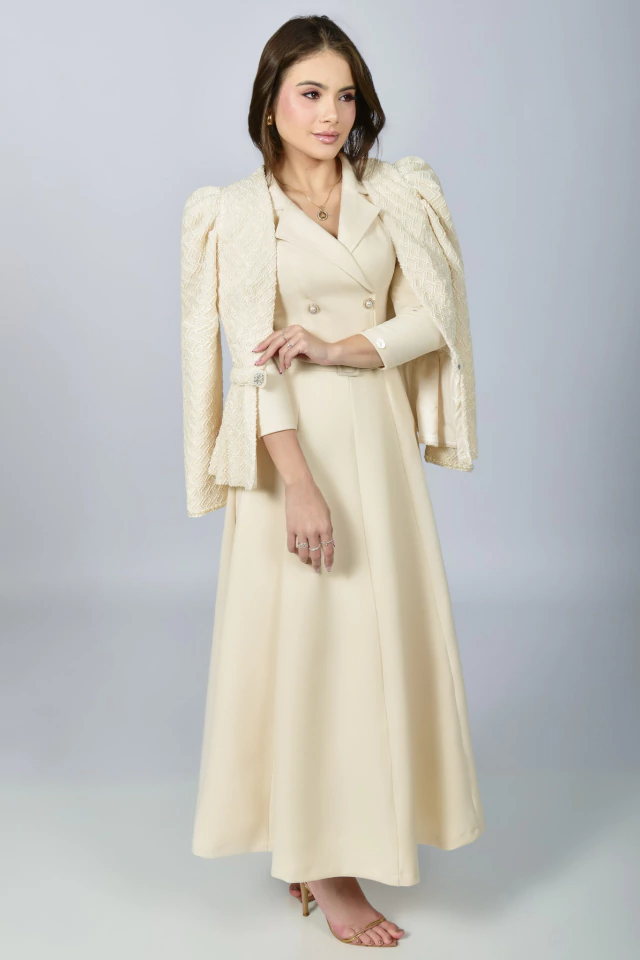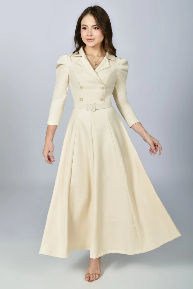 Aquela peça que vai te deixar extremamente elegante, em um tom Off White deslumbrante! Sua modelagem mais acinturada traz um toque retrô clássico ao visual, perfeito para você brilhar em todas as ocasiões! O Vestido Supermidi Realeza possui uma modelagem impecável que só a Mustache tem! Confeccionado no Alfaiataria Madrid {tecido bem confortável com elastano}, possui: forro, gola colarinho, corpinho acinturado com botões de metal {enfeite} na frente com strass e pérolas, decote transpassado, manga 7/8 com preguinhas na altura do ombro, saia com recortes na vertical {frente e atrás} com uma modelagem perfeita, zíper atrás e para completar, cinto todo encapado para modelar ainda mais a cintura. Uma peça cheia de charme e pensada em todos os detalhes para você arrancar suspiros por onde passar!