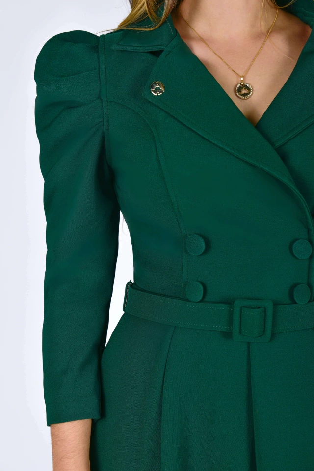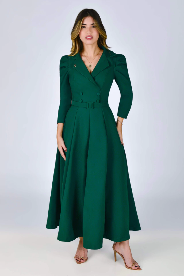 Aquela peça que vai te deixar extremamente elegante, em um tom Verde deslumbrante! Sua modelagem mais acinturada traz um toque retrô clássico ao visual, perfeito para você brilhar em todas as ocasiões! O Vestido Supermidi Realeza possui uma modelagem impecável que só a Mustache tem! Confeccionado no Alfaiataria Madrid {tecido bem confortável com elastano}, possui: forro, gola colarinho, corpinho acinturado com botões encapados {de enfeite} na frente, decote transpassado, manga 7/8 com preguinhas na altura do ombro, saia com recortes na vertical {frente e atrás} com uma modelagem perfeita, zíper atrás e para completar, cinto todo encapado para modelar ainda mais a cintura. Uma peça cheia de charme e pensada em todos os detalhes para você arrancar suspiros por onde passar!
