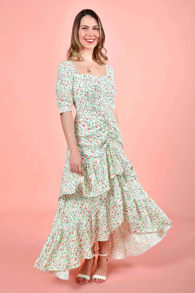 Um vestido cheio de delicadeza para se apaixonar à primeira vista! O modelo Supermidi Veneza Portuguesa traz todo o charme da estampa liberty colorida: um mini floral encantador que traduz romantismo e frescor em cada detalhe. As pequenas flores, delicadamente espalhadas sobre o tecido, criam um visual poético e atemporal. Leve e fluído, o tecido em fibras naturais: Noruega {Algodão e Viscose} traz movimento suave à peça, realçando sua feminilidade de forma sutil e elegante! Com uma modelagem retrô que amamos, possui também: forro de algodão, decote princesa, manga 3/4 princesa com punho, corpinho acinturado com drapeados na frente, cordão na cintura todo franzidinho com regulagem {você pode fazer lacinho na frente ou usar soltinho} e lindas ponteiras em metal {banhadas a ouro} personalizadas da Mustache, zíper atrás, saia com leve fenda na frente, babadinhos e modelagem estilo mullet {com caída na parte de trás}, garantindo sofisticação e um caimento impecável!