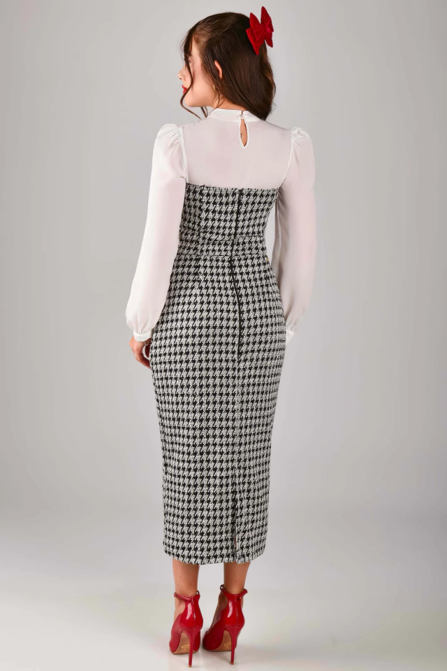 Os tubinhos são peças clássicas que podem ser usadas no dia a dia ou em produções mais elaboradas! Em uma composição perfeita de modelagem e tecido, com uma bela estampa pied de poule para deixar o visual ainda mais elegante! Aquela peça que valoriza a silhueta de forma bem confortável e sutil! Ainda pode ser combinado com camisa e casaqueto para deixá-lo ainda mais perfeito! O Vestido Tubinho Bela Princesa é todo confeccionado em Tweed Francês {tecido bem confortável, com elastano}, no modelo tomara que caia e possui: forro, tira fake na frente com fofíssimos botões de metal de enfeite {fixo} todo em strass {uma verdadeira joia}, leve fenda atrás {para dar um conforto} e zíper atrás. A escolha perfeita para todas as ocasiões!