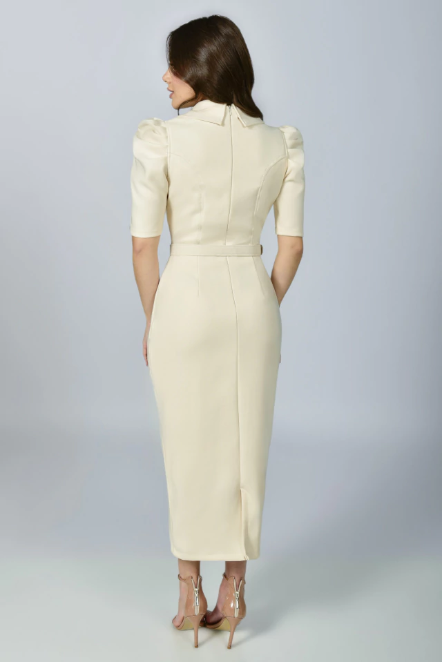 Um modelo primoroso, delicado e elegante ao mesmo tempo, para você esbanjar muito charme por onde passar! Em uma composição perfeita de modelagem e tecido, na cor Off White para deixar o visual ainda mais elegante! O Vestido Tubinho Celebridade é todo confeccionado no Alfaiataria Madrid {tecido bem confortável com elastano}, possui: forro, gola colarinho, corpinho acinturado com botões em metal de strass e pérola de enfeite na frente {fixo}, decote transpassado, manga 3/4 com preguinhas na altura do ombro, leve fenda atrás {para um conforto maior ao andar}, saia com detalhe transpassado na frente, zíper atrás e para completar, cinto todo encapado para modelar ainda mais a cintura. Uma peça cheia de charme e pensada em todos os detalhes para você arrancar suspiros por onde passar!